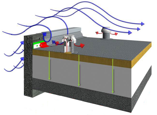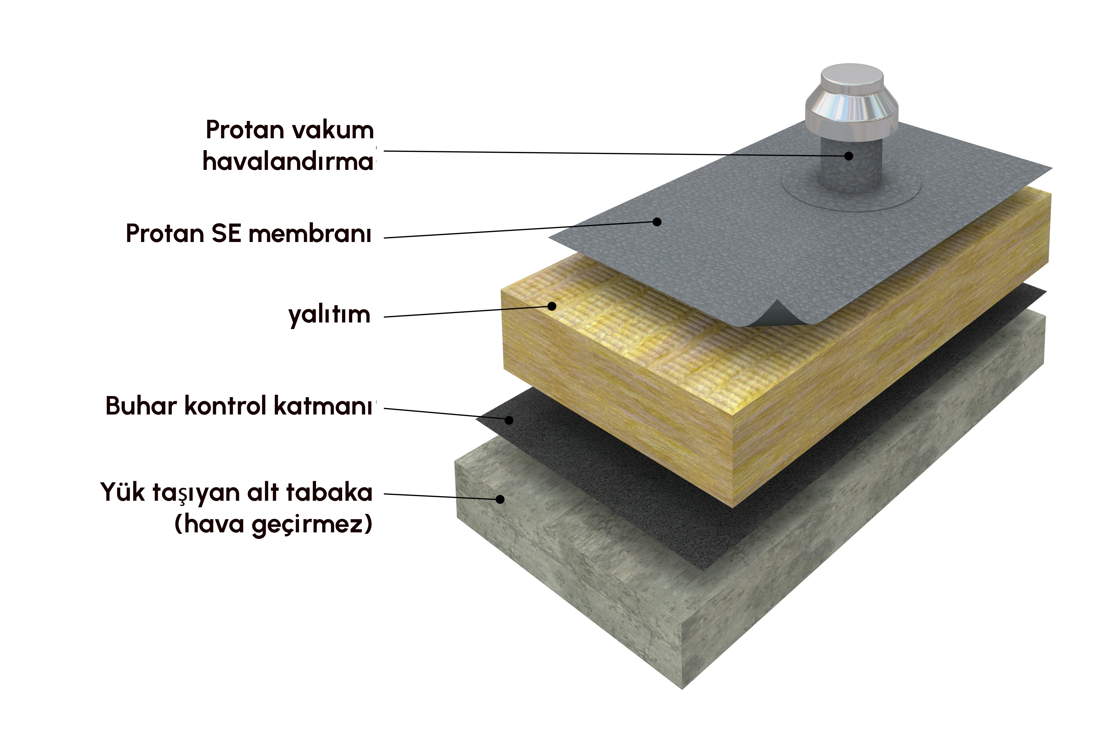 Hava geçirmez yapısal çatı membranı üzerine Protan onaylı, alevle çalıştırılan, bitümlü bir buhar kontrol katmanı, ardından Protan onaylı yalıtım ve Protan SE veya EX tek katlı membran monte edilir.
