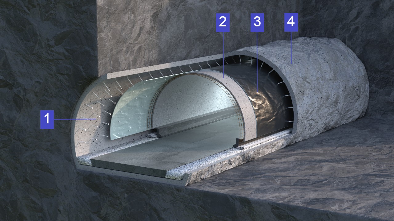 Sistem, püskürtme betonla kaplı kaya/dağ ile yaklaşık 50 cm aralıklarla yerleştirilmiş bir ankraj ızgarasına monte edilmiş bir su yalıtım membranından oluşur. Membran trafiğe dönük olarak ya beton parçalarla ya da içten püskürtme betonla kaplanır.